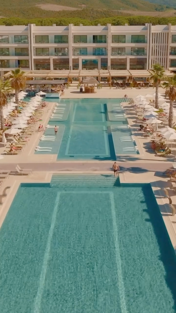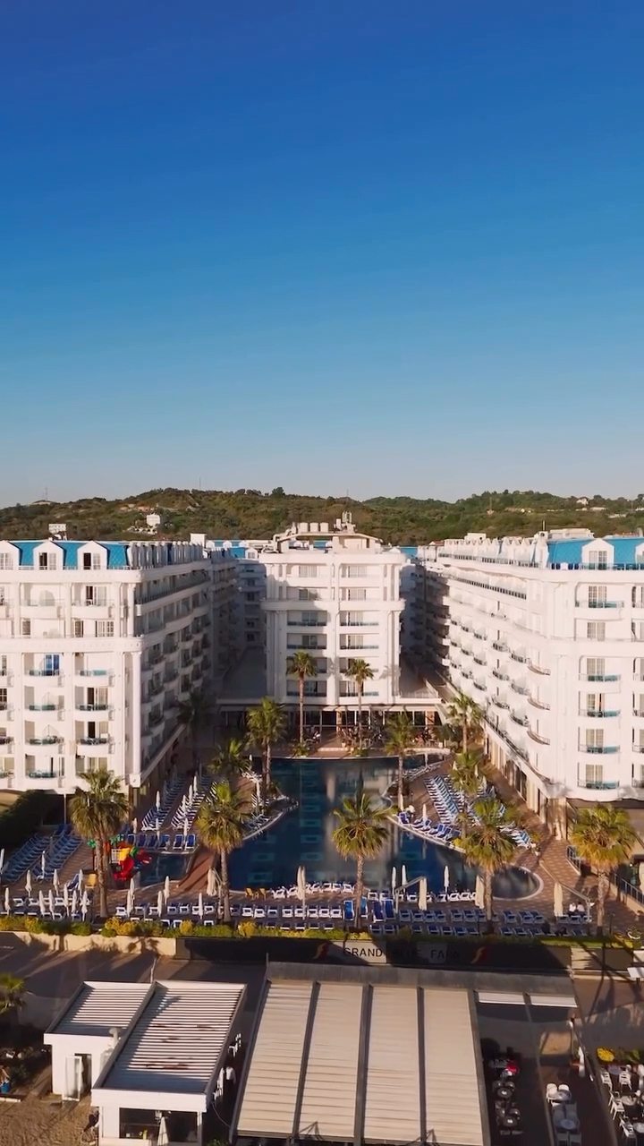 Welcome guests with a drone shot and a view of the lobby. Avoid showing scenes if that are not typical, such as a welcome drink or a staff greeting.